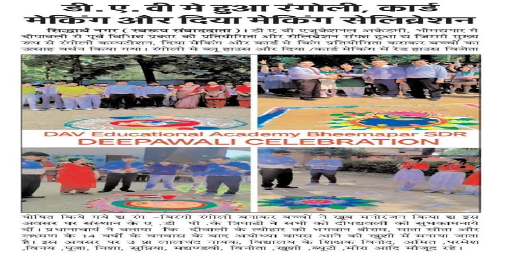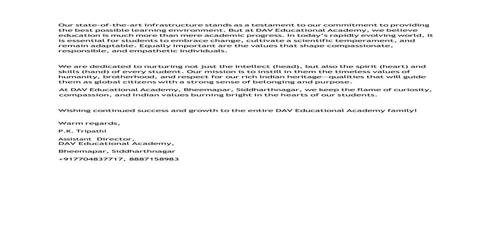 DAV Educational Academy, Bheemapar, siddharthnagar makes all of us feel proud for having earned a reputation as an Institution making its mark in every field year after year. It has been progressing by leaps and bounds. If students have been writing the story of its success year after year, efforts of its staff are commendable for their sincerity of purpose. Infrastructure wise, it stands apart.